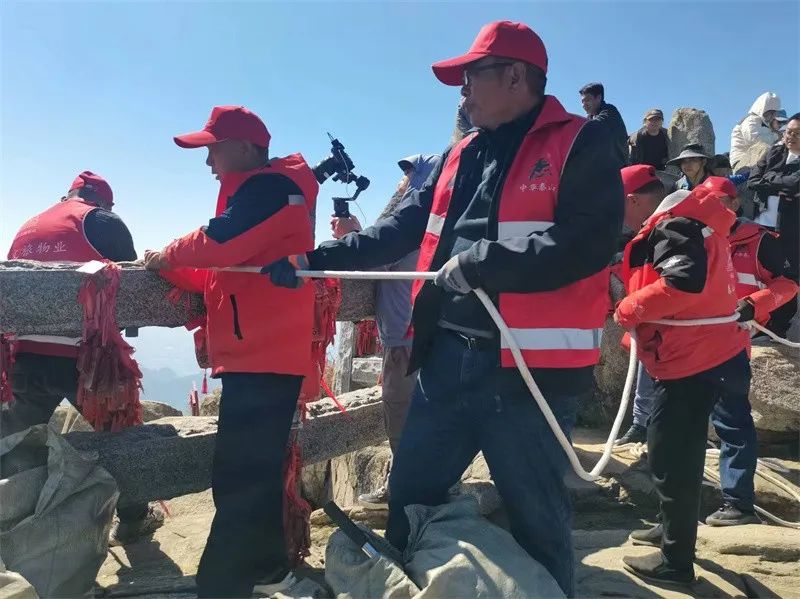 “一定要注意安全”“把繩子再往下放一點(diǎn)”“再往左一點(diǎn)”……10月3日的泰山之巔,瞻魯臺(tái)處的崖壁上,身穿紅馬甲的環(huán)衛(wèi)工人們正有條不紊地進(jìn)行他們?nèi)粘5膽已滦l(wèi)生清潔工作。這種在懸崖上作業(yè)的工作對(duì)于很多人來(lái)說(shuō)陌生又驚險(xiǎn),但對(duì)這群被稱作“泰山美容師”的環(huán)衛(wèi)工來(lái)說(shuō),只是日常工作。假期泰山游客增多,隨之而來(lái)的產(chǎn)生的垃圾量也增多,尤其是懸崖峭壁處的垃圾,需要及時(shí)清理。在溝壑、山坡較多的地方,不方便行走怎么辦?泰山環(huán)衛(wèi)工的選擇是“像蜘蛛俠一樣爬”!袄绻謇聿患皶r(shí),天氣炎熱時(shí)導(dǎo)致食品類垃圾變質(zhì),會(huì)產(chǎn)生難聞的氣味和污染山頂環(huán)境,影響游客的旅游體驗(yàn)。”泰山文旅集團(tuán)物業(yè)公司南天門(mén)片區(qū)經(jīng)理趙興忠告訴記者,日常平均一周需要到拱北石、瞻魯臺(tái)、獅子峰、天街等處懸崖?lián)焓扒謇砝鴥纱危淮螕焓袄鴥纱蛉。假日期間,“蜘蛛俠”們一天需要下懸崖兩次,清理懸崖死角垃圾時(shí)要下懸崖兩個(gè)人,撿拾垃圾10袋,小點(diǎn)的點(diǎn)位,下懸崖一次一個(gè)小時(shí),大點(diǎn)的熱門(mén)區(qū)域死角清理一次則需要3個(gè)小時(shí)。