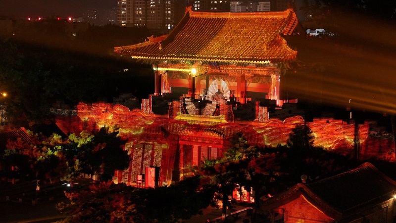 每日14時30分,活動特邀來自肥城夢幻桃花源的專業(yè)演職團隊帶來專場文藝演出。當夜幕降臨,18時30至21時(每半小時一場),岱廟北城墻將變身“巨型光影幕布”,上演燈光秀表演。光影流轉(zhuǎn)間,千年歷史與現(xiàn)代科技碰撞融合,讓游客在光影變幻中直觀感受泰山文化的厚重底蘊與魅力。