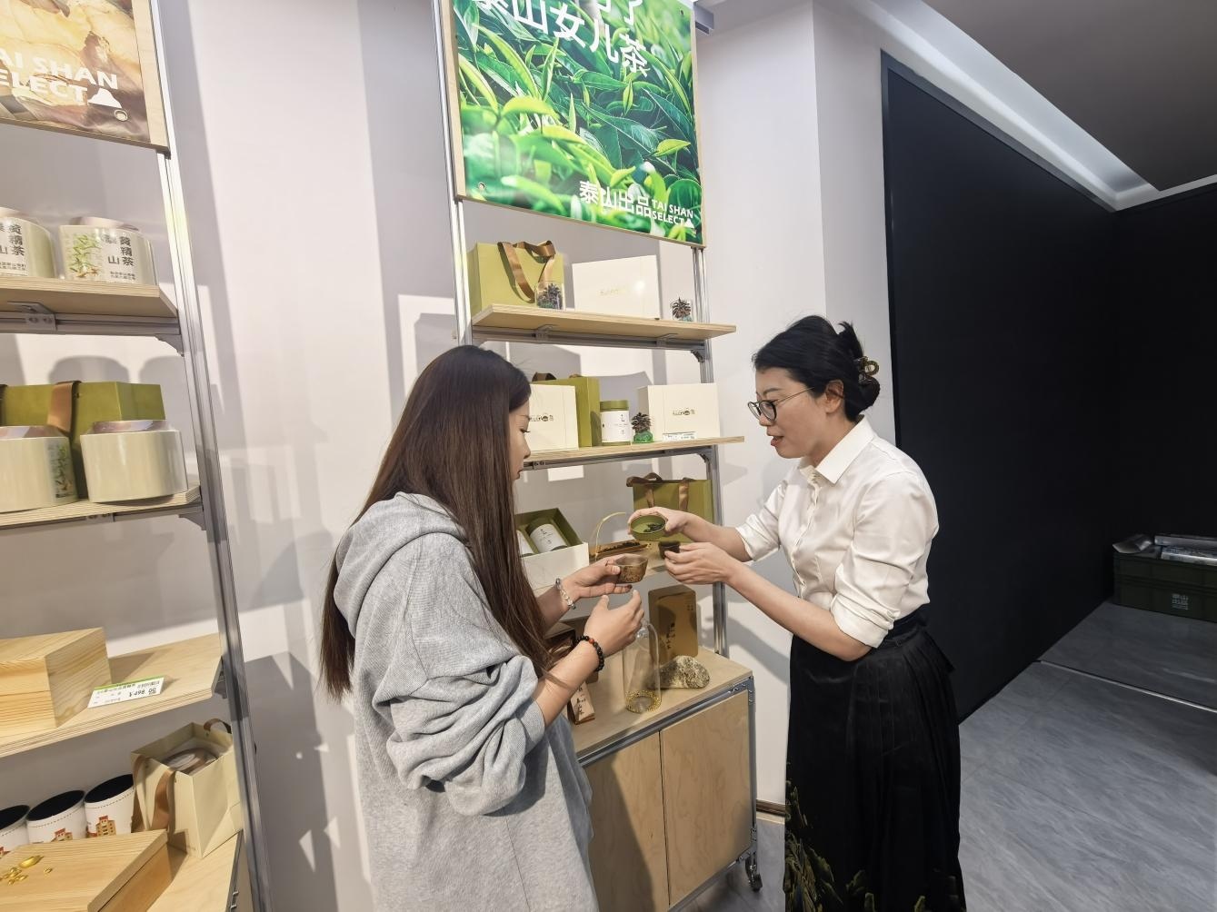 活動(dòng)期間,各門(mén)店精心布置展示區(qū),茶藝師以規(guī)范雅致的茶藝流程,呈現(xiàn)泰山綠茶的沖泡技藝與品飲禮儀。茶藝師同步講解泰山綠茶的歷史淵源、傳統(tǒng)工藝與品質(zhì)等特點(diǎn),向游客介紹產(chǎn)品特質(zhì),講述泰山茶與泰山文化相伴相生的故事。